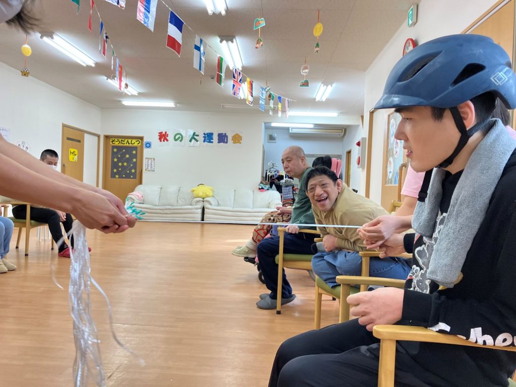 長さを競うゲーム😯順番に紐を引いて、繋げて…おっと?これは長そうだ!あれあれ~、赤チームがちょっと優勢かもよ~😁