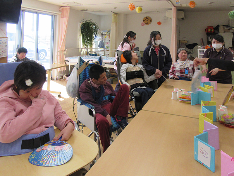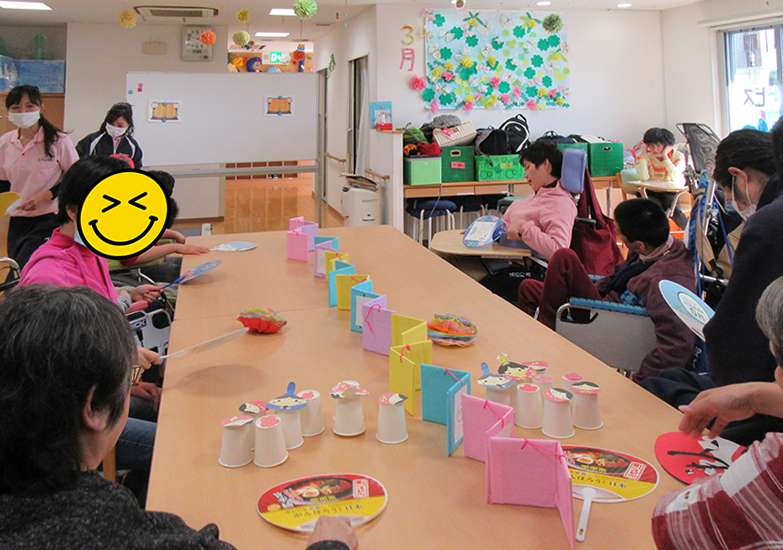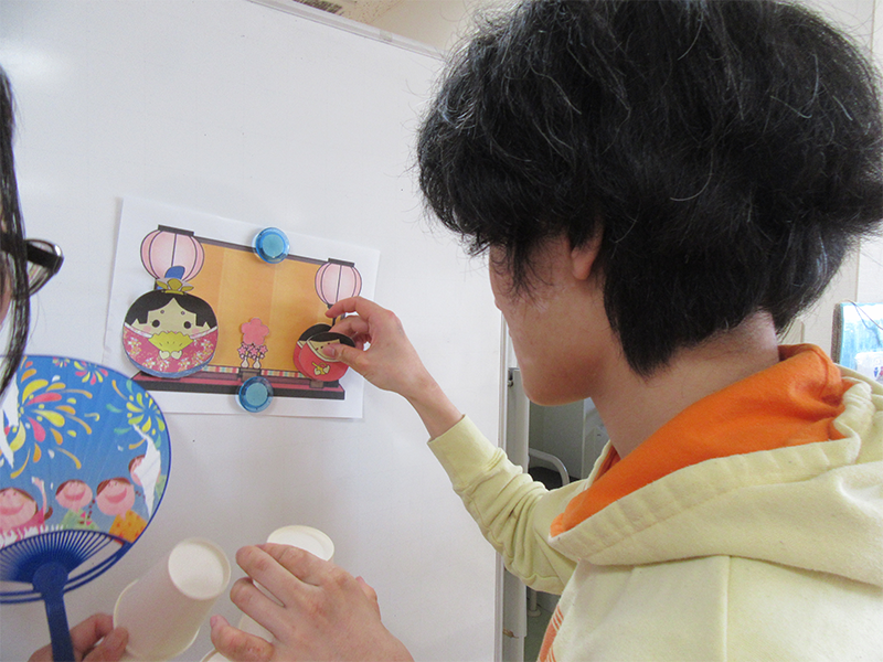 ゴールしたおひなさま達を屏風の前に飾ります。