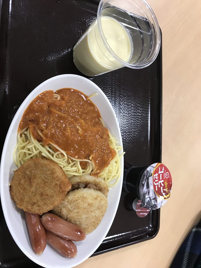 今日のお昼のメニューはスパゲティ、ライスバーガー、コロッケ、ウィンナーにコーンポタージュとコーヒーゼリーでした!
