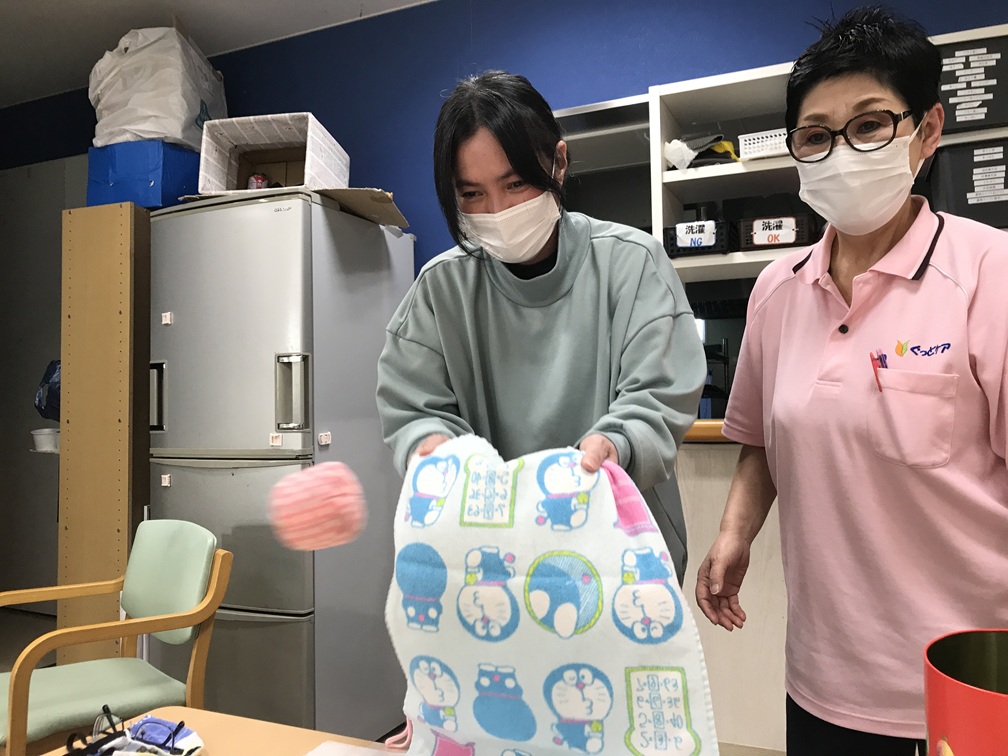 クロスをサッと引いて上にのっている食器などをテーブルから落とさないようにする芸なのですが、今日のレクはタオルにお手玉を乗せて思い切りタオルを持ち上げ、その反動でボールを遠くに飛ばすという真逆のゲームです^^