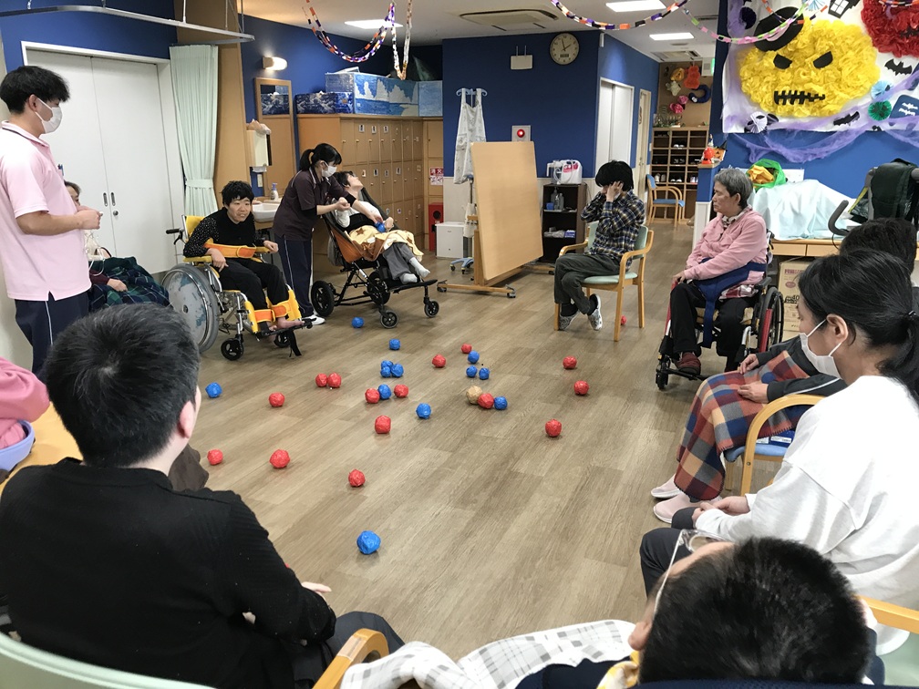 赤チーム青チームに分かれ、茶色の玉を目掛けて投げていきます!