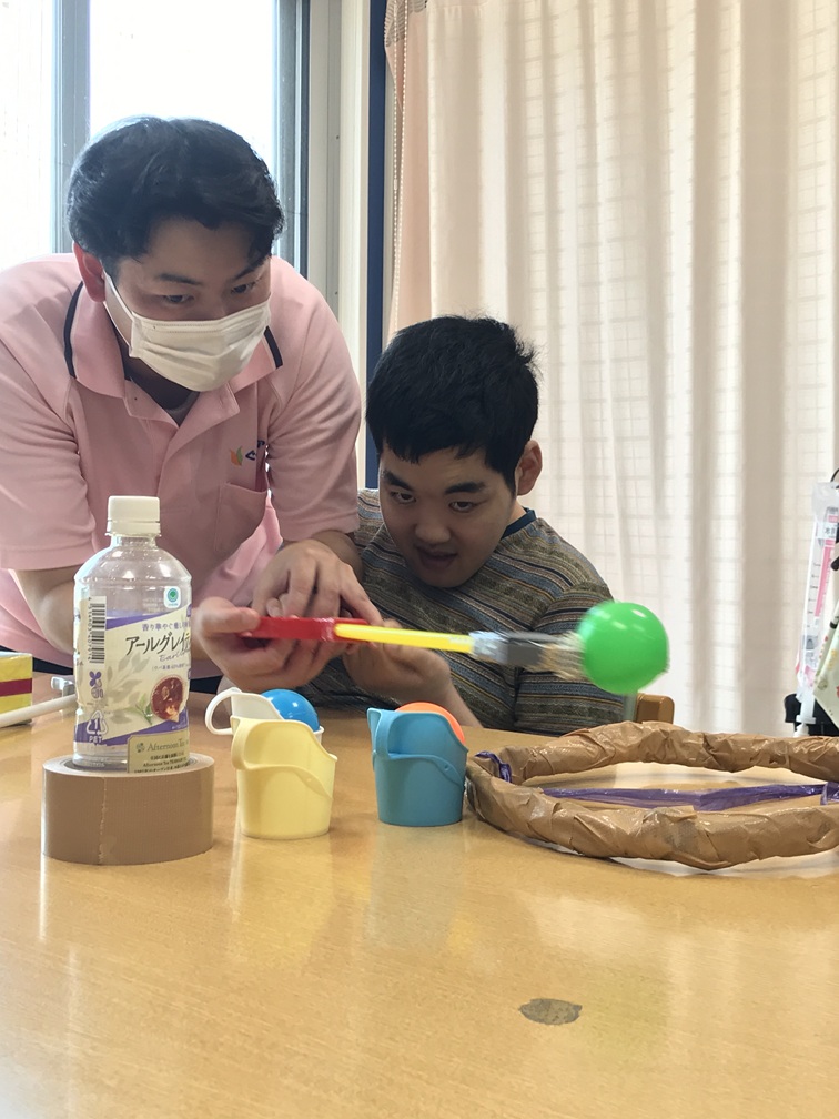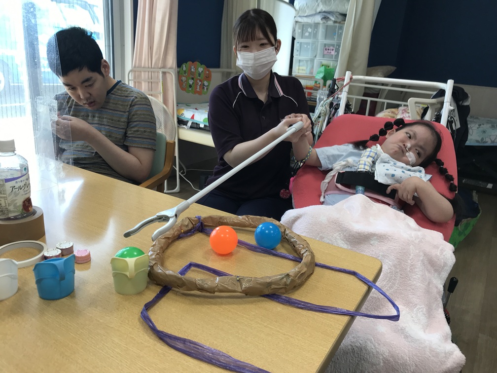 マジックハンドを使って、3種類のミニゲームを組み合わせたものを一番早くこなせたチームが得点となるゲームをしました。
