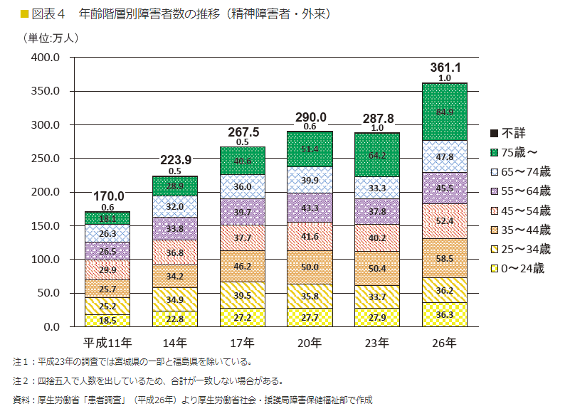 外来の年齢階層別精神障害者数の推移(図表4)について、平成26(2014)年においては、精神障害者総数 361万1千人のうち、25歳未満 36万3千人(10.1%)、 25歳以上 65歳未満 192万6千人(53.3%)、65歳以上132万7千人(36.7%)となっており、65歳以上の者の割合が高い。 外来の精神障害者の全年齢のうち、65歳以上の割合は、平成20(2008)年から平成26年までの6年間で、31.5%から36.7%へと上昇している。