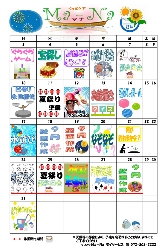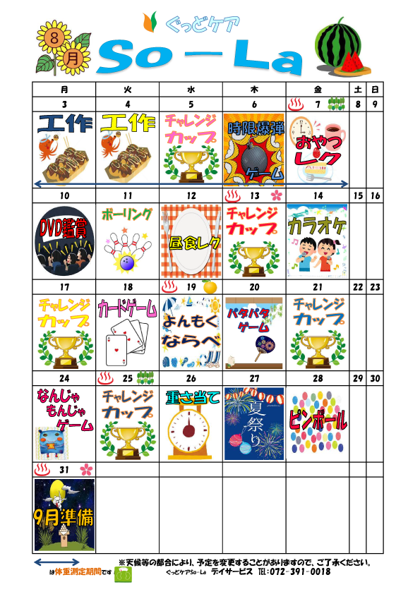 Ma-Na So-La ぽらりす 施設blog レク表 8月のレクスケジュール表です 2020年7月30日 2020年9月7日 Facebook Twitter はてブ Ma-Na ・So-La・ぽらりすのレク表 ぽらりす So-La Ma-Naそれぞれの8月のレク表をアップしましたのでご参考にされてください。 Facebook Twitter はてブ